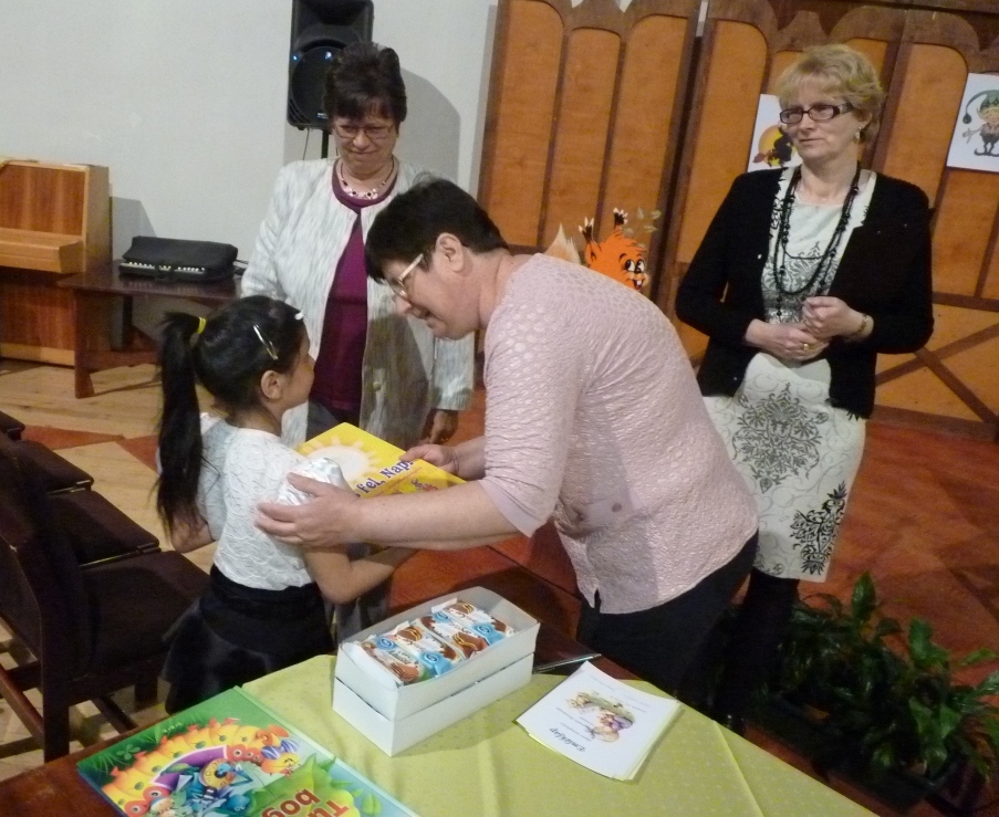 A 17 nevező közül a kéttagú zsűri (Baloghné Pintér Katalin és Szabó Gáborné, volt óvónők) 7 gyereknek adott át egy-egy szép meséskönyvet és oklevelet, a többiek pedig emléklapot kaptak. Persze most sem maradhatott el a szokásos édesség sem, aminek nagy sikere volt.
