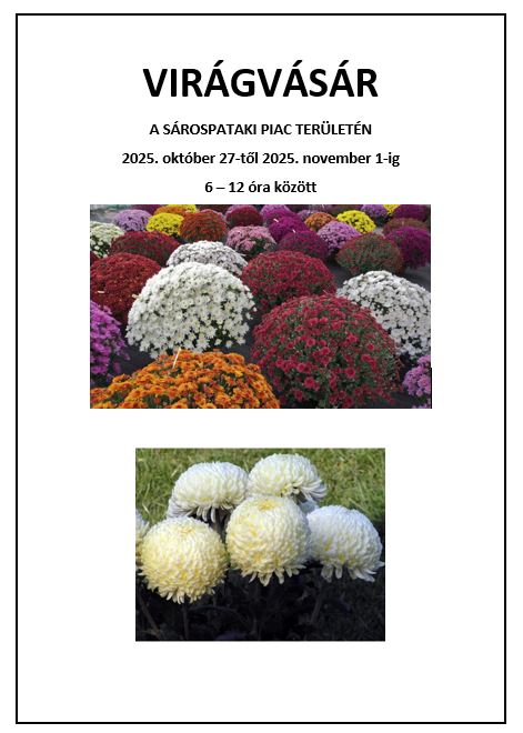 Virágvásár Sárospatakon a piac területén 2025.10.27-től november 1-ig 6-12 óra között 2025. október 8. 12:03 Közérdekű közlemények Nyitó hírek Városháza Megosztás Facebook (0) Google + (0) Küldés E-mail-ben Nyomtatás Feltöltő Tóth Gábor