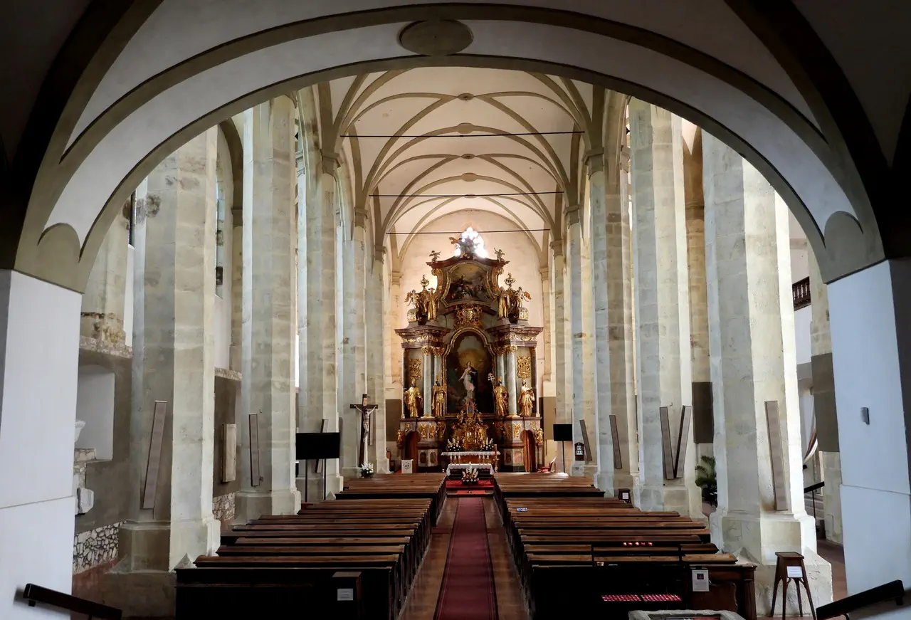 A ma látható, háromhajós gótikus csarnoktemplom 1492-re készült el. A templom:
